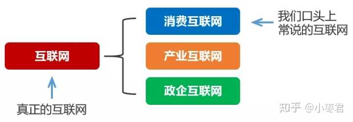 注意,我們普通用戶平時接觸的互聯(lián)網(wǎng)(包括移動互聯(lián)網(wǎng)),準(zhǔn)確來說,只是“真正互聯(lián)網(wǎng)”的一個分支,稱之為“消費(fèi)互聯(lián)網(wǎng)”。