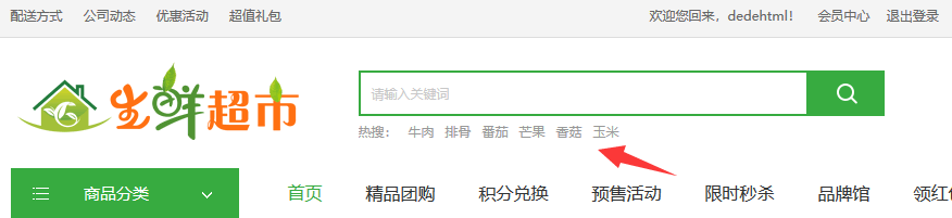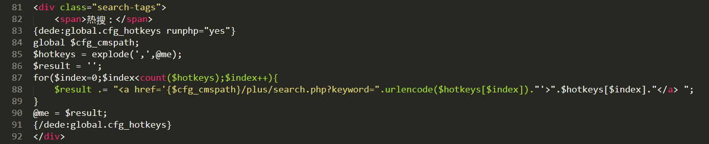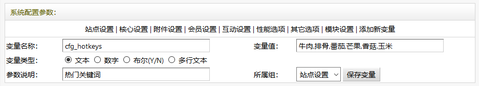 后臺(tái)-系統(tǒng)-基本參數(shù)-添加變量 變量名稱(chēng) cfg_hotkeys 變量類(lèi)型 文本 參數(shù)說(shuō)明 熱門(mén)關(guān)鍵詞 變量值 牛肉,排骨,番茄,芒果,香菇,玉米 前臺(tái)模板標(biāo)簽調(diào)用 {dede:global.cfg_hotkeys runphp="yes"} global $cfg_cmspath; $hotkeys = explode(',',@me); $result = ''; for($index=0;$index<count($hotkeys);$index++){ $result .= "<a href='{$cfg_cmspath}/plus/search.php?keyword=".urlencode($hotkeys[$index])."'>".$hotkeys[$index]."</a> "; } @me = $result; {/dede:global.cfg_hotkeys}