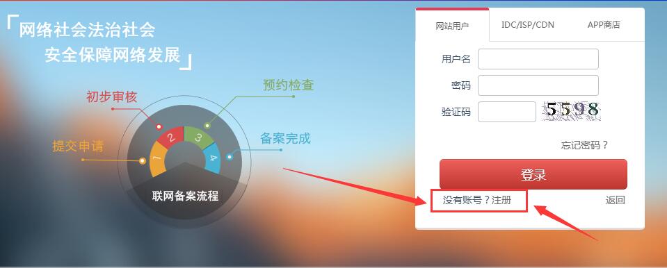 打開http://www.beian.gov.cn/頁面,在登陸框下面有注冊(cè)選項(xiàng),如圖: