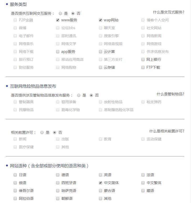 (3)網(wǎng)站語種(含全部或部分使用的語言種類)。一般選擇【中文簡(jiǎn)體】即可。