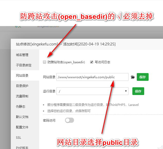 然后點擊網(wǎng)站 設置  防跨站攻擊取消勾選  網(wǎng)站運行目錄選擇public