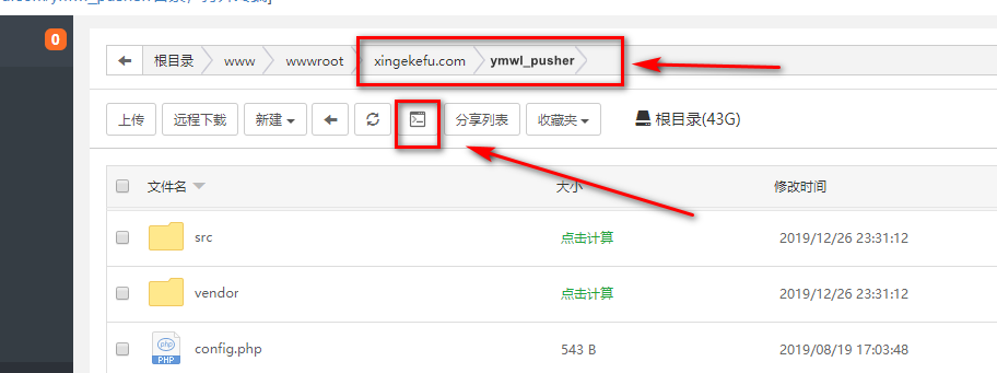 如果沒有出現(xiàn)上圖,一般是由于寶塔版本不同導致初始目錄不同,需要先手動切換到\ymwl_pusher目錄下。