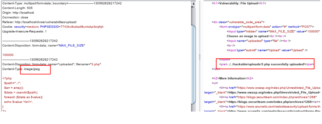 嘗試把請求中content-type改為image/jpeg,再次發(fā)送請求,上傳成功。說明medium模式只驗證了Mime-Type,并沒有驗證文件本身(我傳的還是php文件)