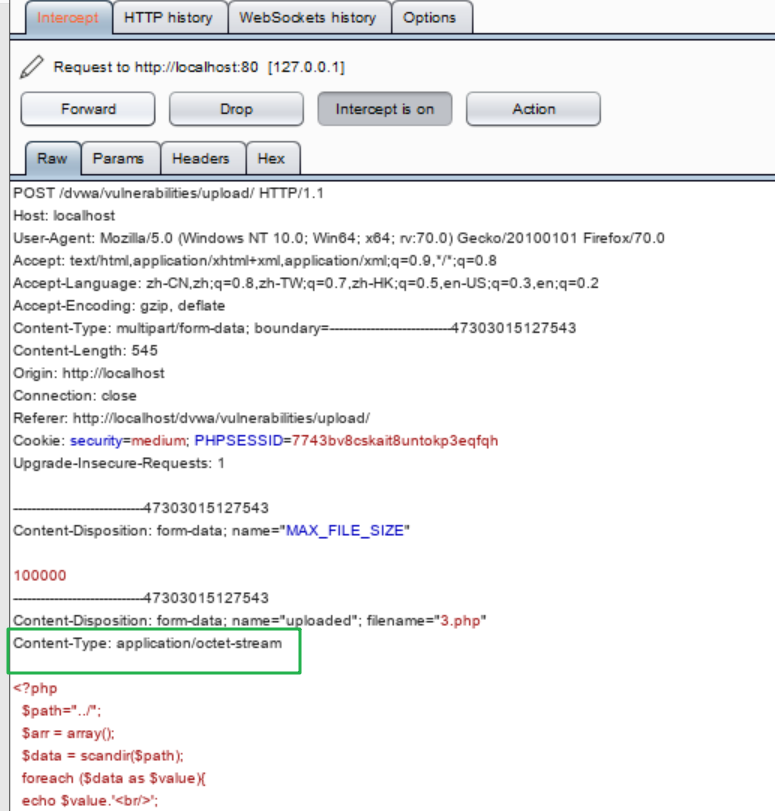 用Burp Suite抓包如下,content-type的類型是octet-stream。根據(jù)頁面的報錯,這個頁面只能傳jpg和png格式的圖片。