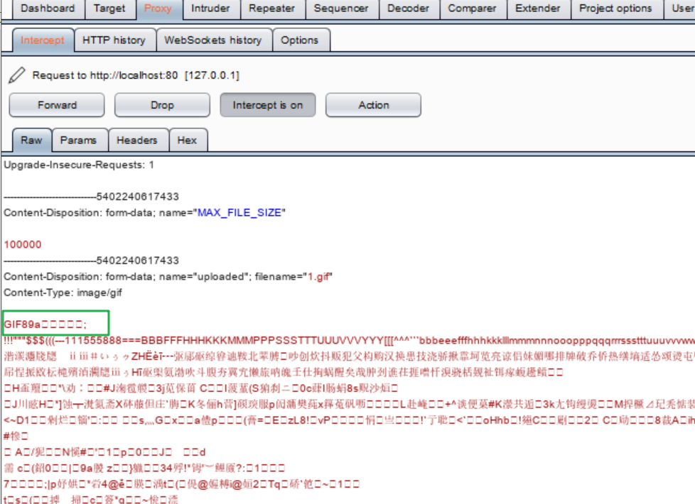 什么是GIF89a呢?先上傳一張貨真價實的gif圖片,抓包如下圖,圖片的最開始幾個字母就是GIF89a。個人理解GIF89a應(yīng)該是gif文件的開頭標志,只要有這個標志,就會被當做gif圖片~