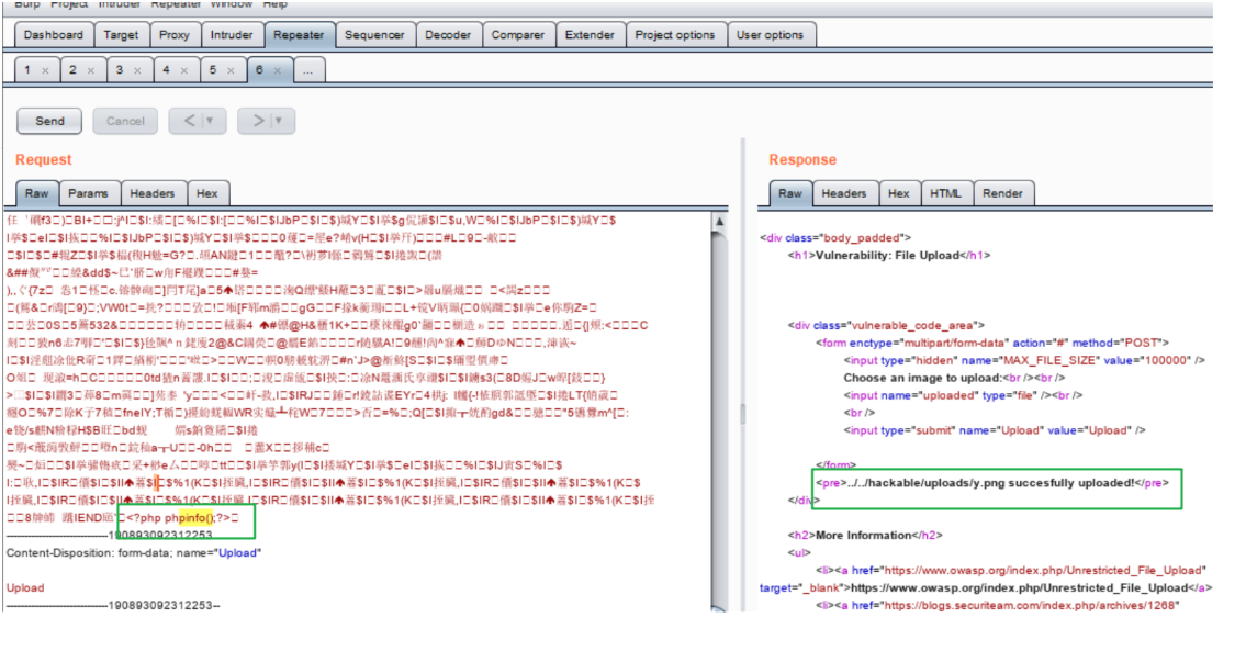 用Burp Suite抓包看到我們的代碼已經(jīng)隱藏在圖片里了,然后直接上傳即可(因為文件格式是符合要求的)