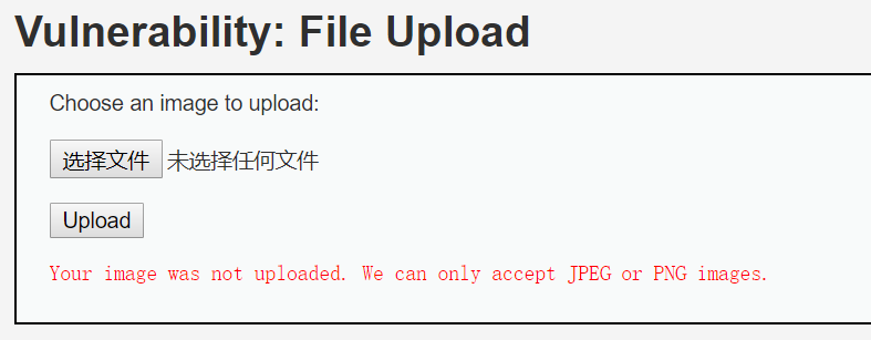 我用DVWA的文件上傳來做練習,low模式?jīng)]有任何驗證,隨便上傳任意大小和類型的文件,現(xiàn)實中一般不會存在,故跳過,從medium模式開始。