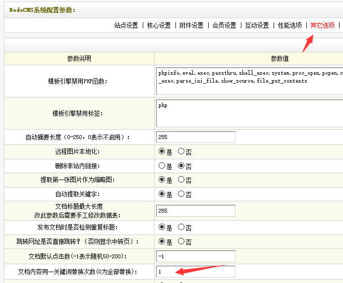 2、后臺(tái)-系統(tǒng)-其他選項(xiàng)-關(guān)鍵詞替換次數(shù),填【1】或者【0】