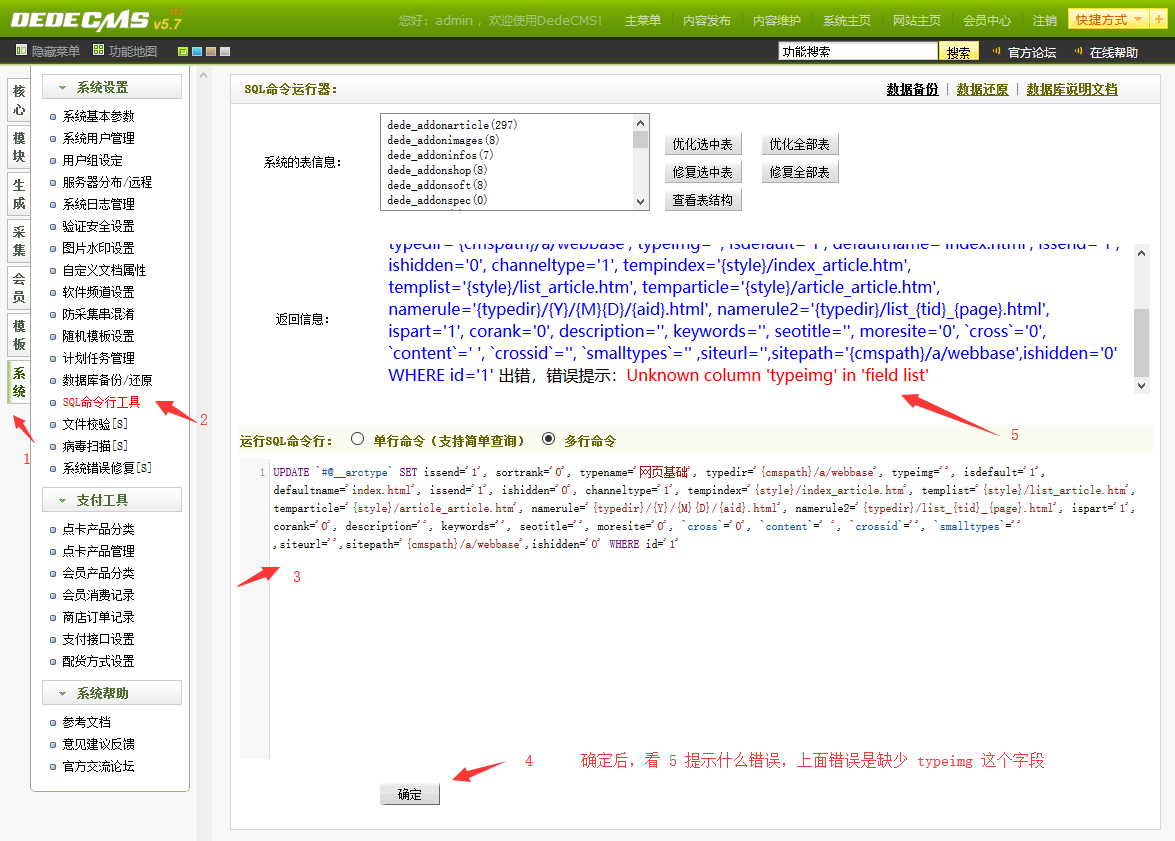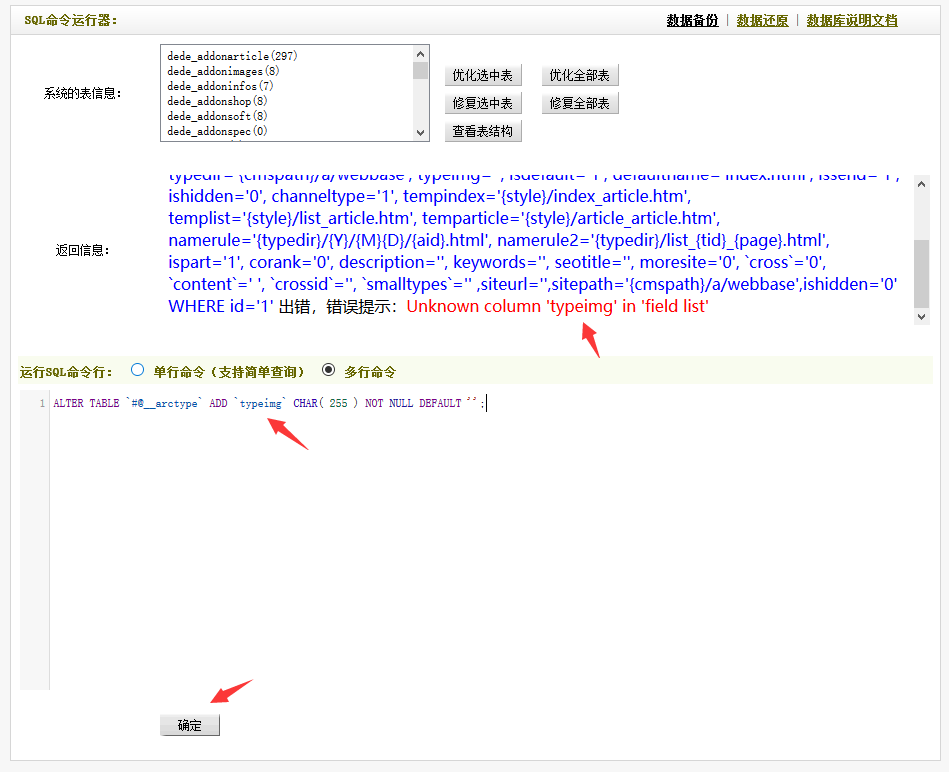 把復制到的語句到后臺-系統(tǒng)-SQL命令行工具,執(zhí)行,看執(zhí)行結(jié)果提示什么錯誤
